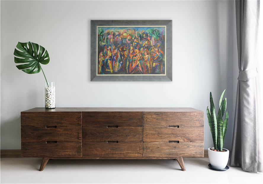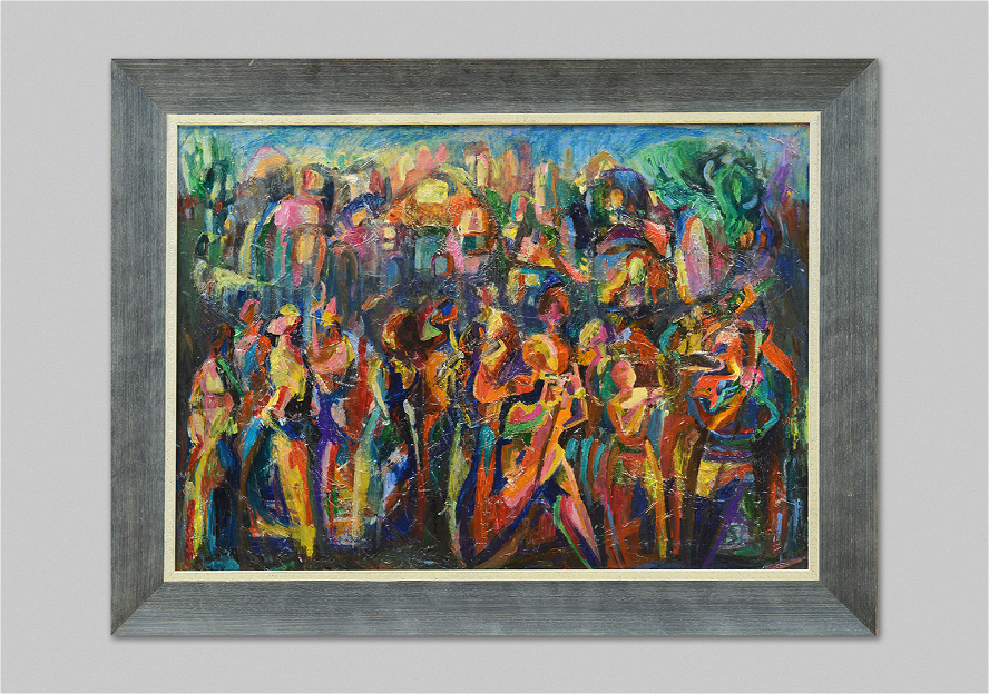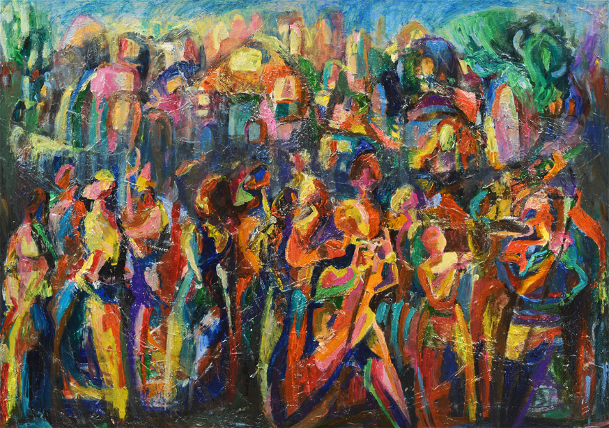 Müəllif kətan üzərində mücərrəd rənglərin qarışığında personajların rəqsini təsvir etməklə, sanki onların özünəməxsus ritmini təqdim etmiş olur.